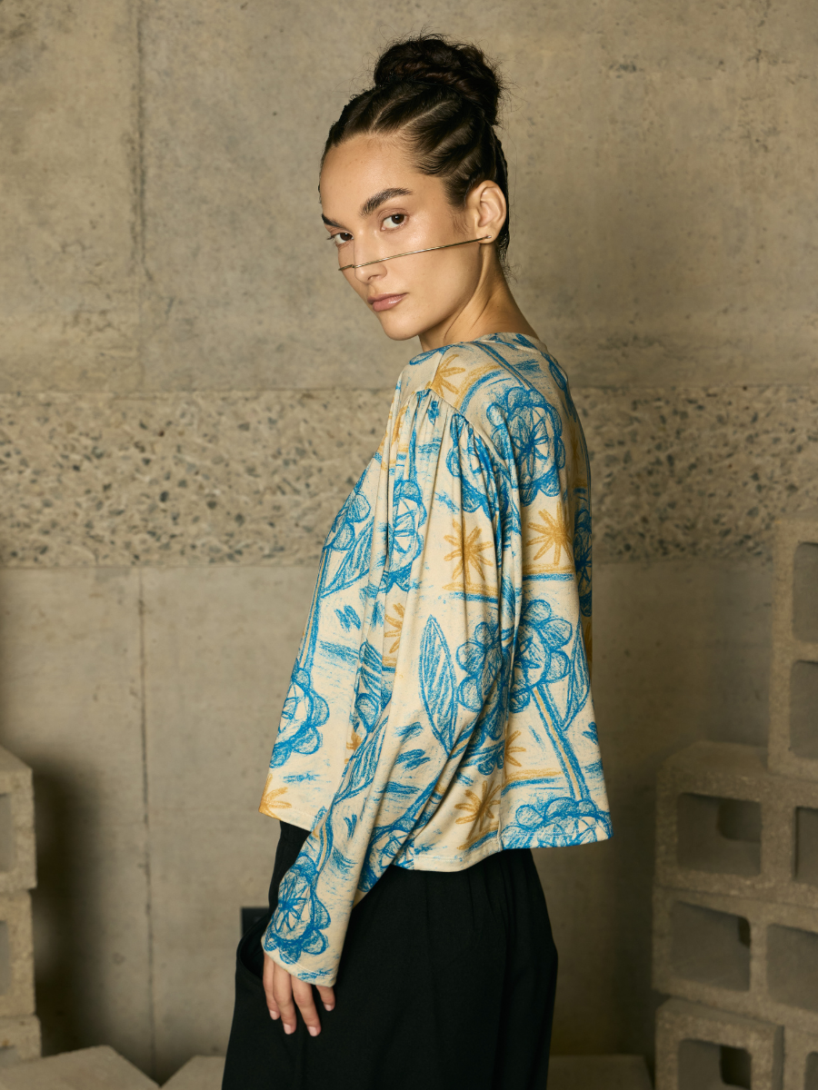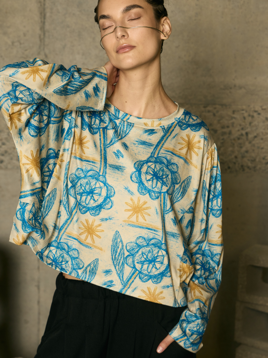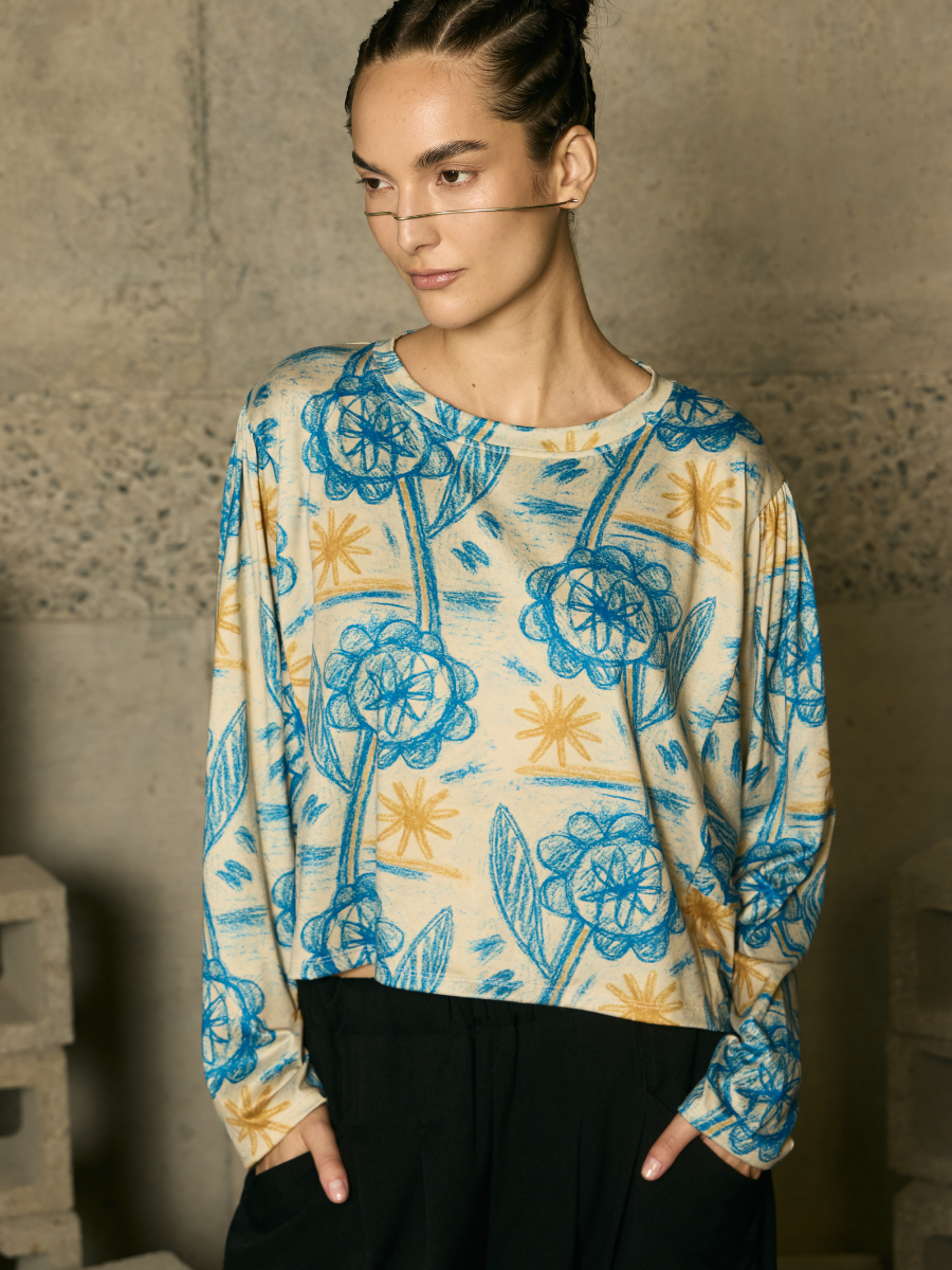 Versatile and fluid, this long-sleeve tee with shoulder gathering blends detail with movement. Its design with subtle pleats and draped fabric offers a modern, delicate edge, perfect for complementing everything from casual denim looks to more sophisticated, graceful ensembles.