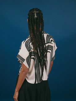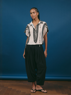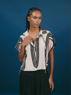 Modern and feminine, this cropped blouse features adjustable drawstrings at the neckline, front button closure, and short sleeves. Its light and versatile silhouette adds a delicate touch—perfect for creating casual or sophisticated looks with effortless style and comfort.