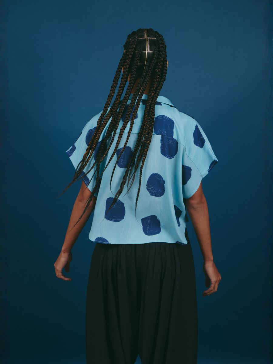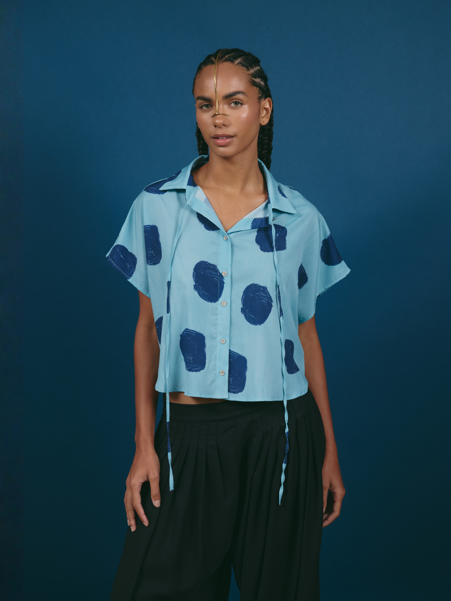 Modern and feminine, this cropped blouse features adjustable drawstrings at the neckline, front button closure, and short sleeves. Its light and versatile silhouette adds a delicate touch—perfect for creating casual or sophisticated looks with effortless style and comfort.