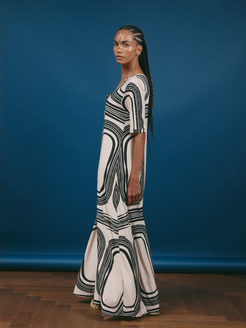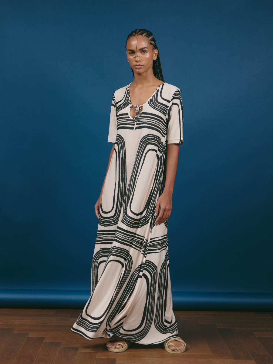 Elegant and fluid, this godet dress features a delicate tie at the neckline that adds a distinctive detail without compromising the design’s lightness. Its wide drape and natural movement enhance the silhouette with comfort—perfect for creating sophisticated or casual looks with a relaxed, contemporary touch.