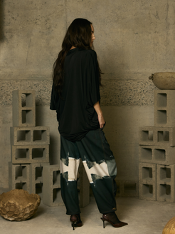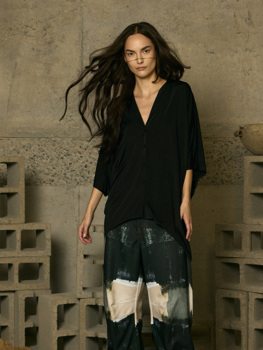 Sophisticated and fluid, this oversized blouse with a shawl collar blends structure with freedom of movement. Its wide silhouette and elongated lapel detail offer a modern, relaxed edge, perfect for complementing everything from casual looks with slim-fit trousers to bolder ensembles with great presence.