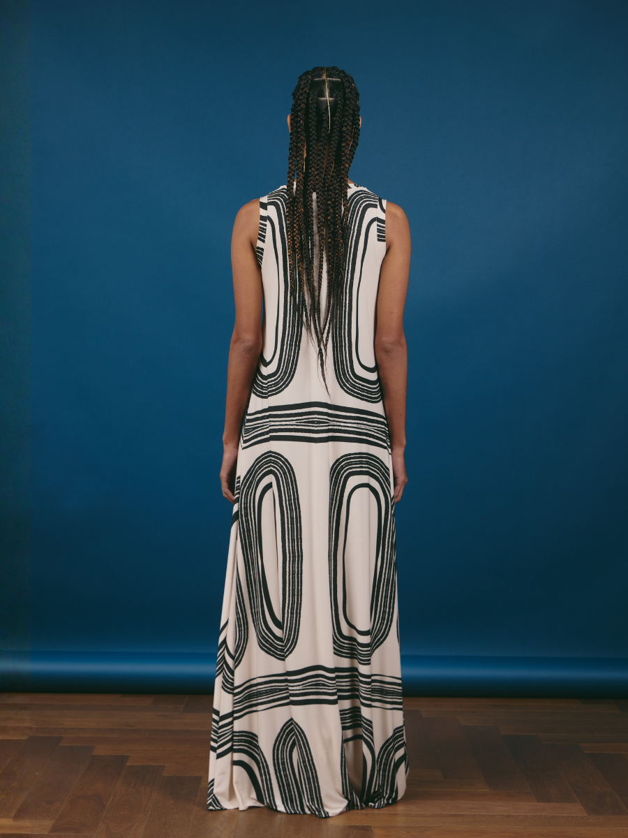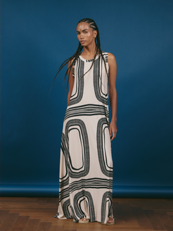 Lightweight and fresh, this sleeveless godet dress stands out for its contemporary aesthetic and soft drape. Its clean design highlights the shoulders and offers a sense of freedom—perfect for summer looks with an elegant, natural feel.