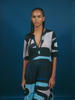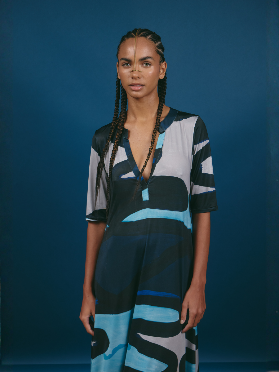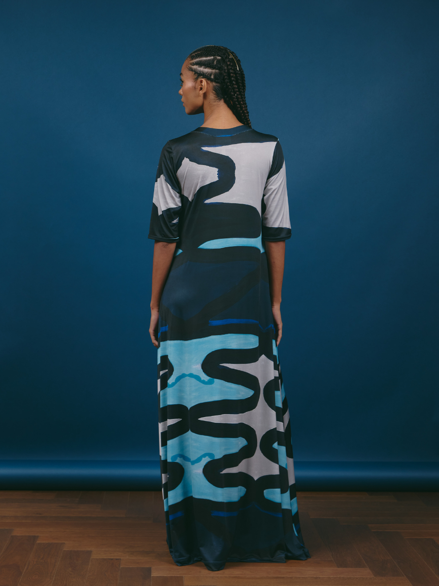Elegant and feminine, this godet dress features a V-neckline and elbow-length sleeves that provide comfort and style....